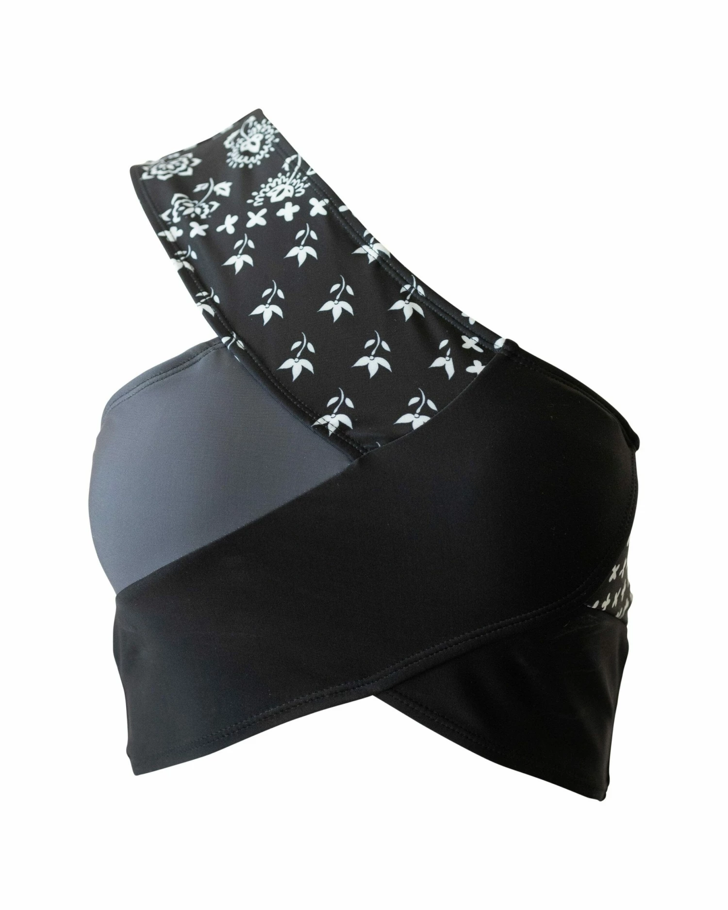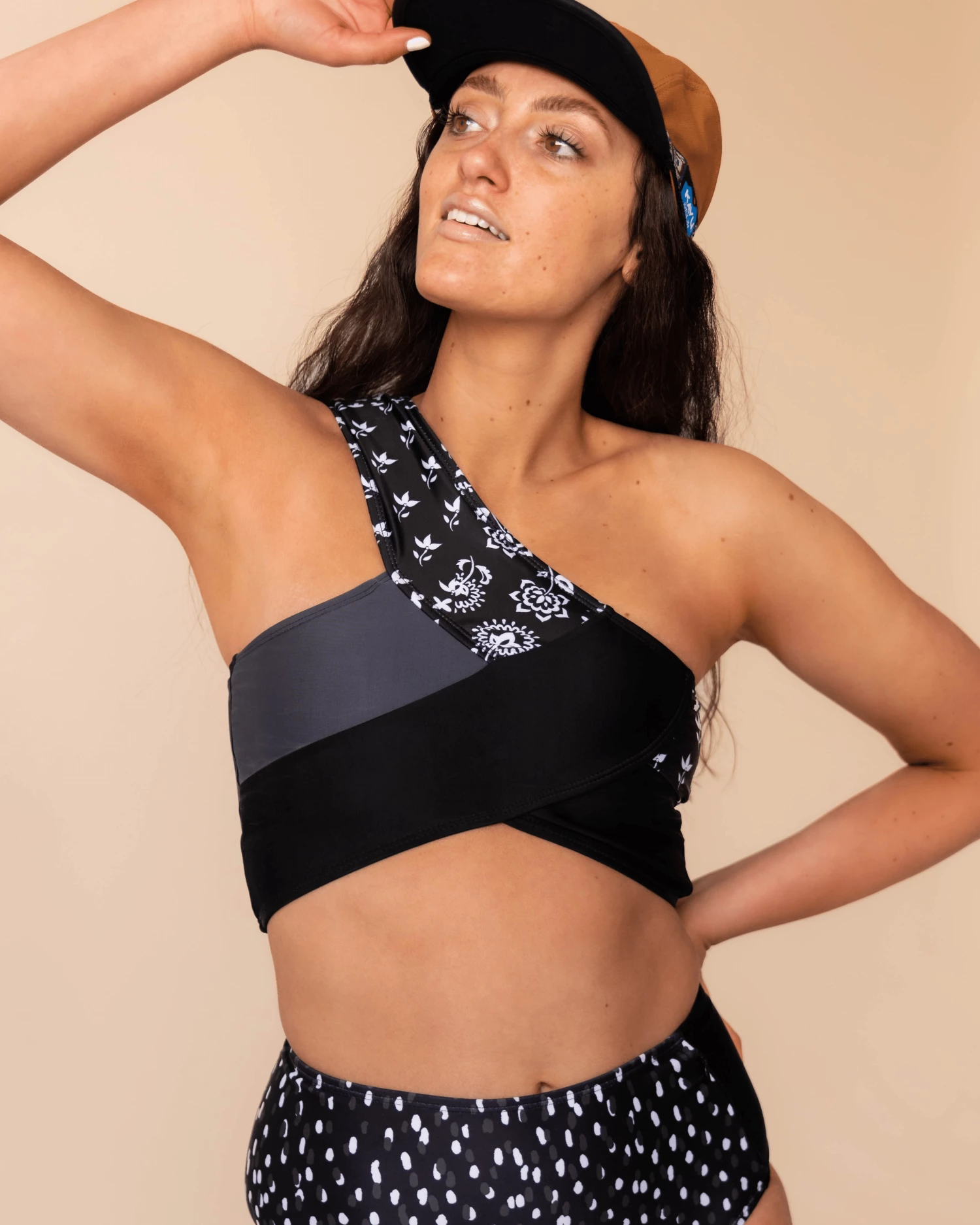 Looking for something NEW and DIFFERENT? This patchwork design is just what you have been waiting for! The one-shoulder, flattering fit keeps you covered and secure while showing off your style as you confidently dive into all your outdoor activities.