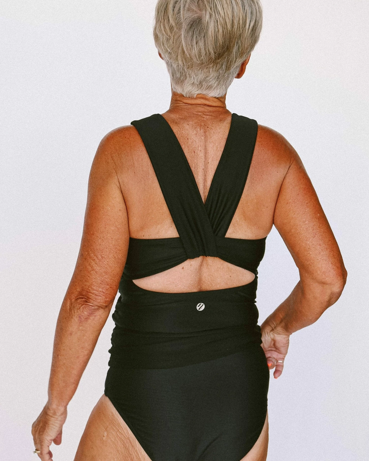 Designed for those who want a little more coverage, this beautiful swim top features a head-turning, unique V-shaped back that combines elevated style with a sporty design.