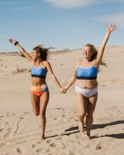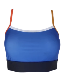 Comfortable AND supportive, the Shaka Bralette has multi-colored straps and just the right length to look good and feel good in and out of the water. Solid bright Capri blue with Cherry Tomato, yellow Beeswax, and bright white colored straps and a dark Blueberry bottom panel.