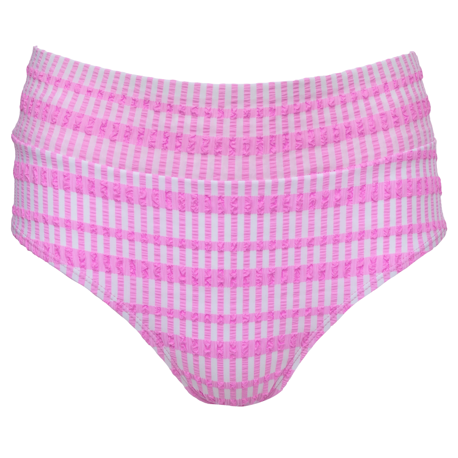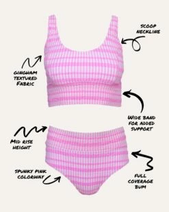 Our mid rise coverage bottom is both supportive and flattering. It’s made with three-dimensional textured gingham fabric in a modern bright pink and white check that will show off your spunky personality.