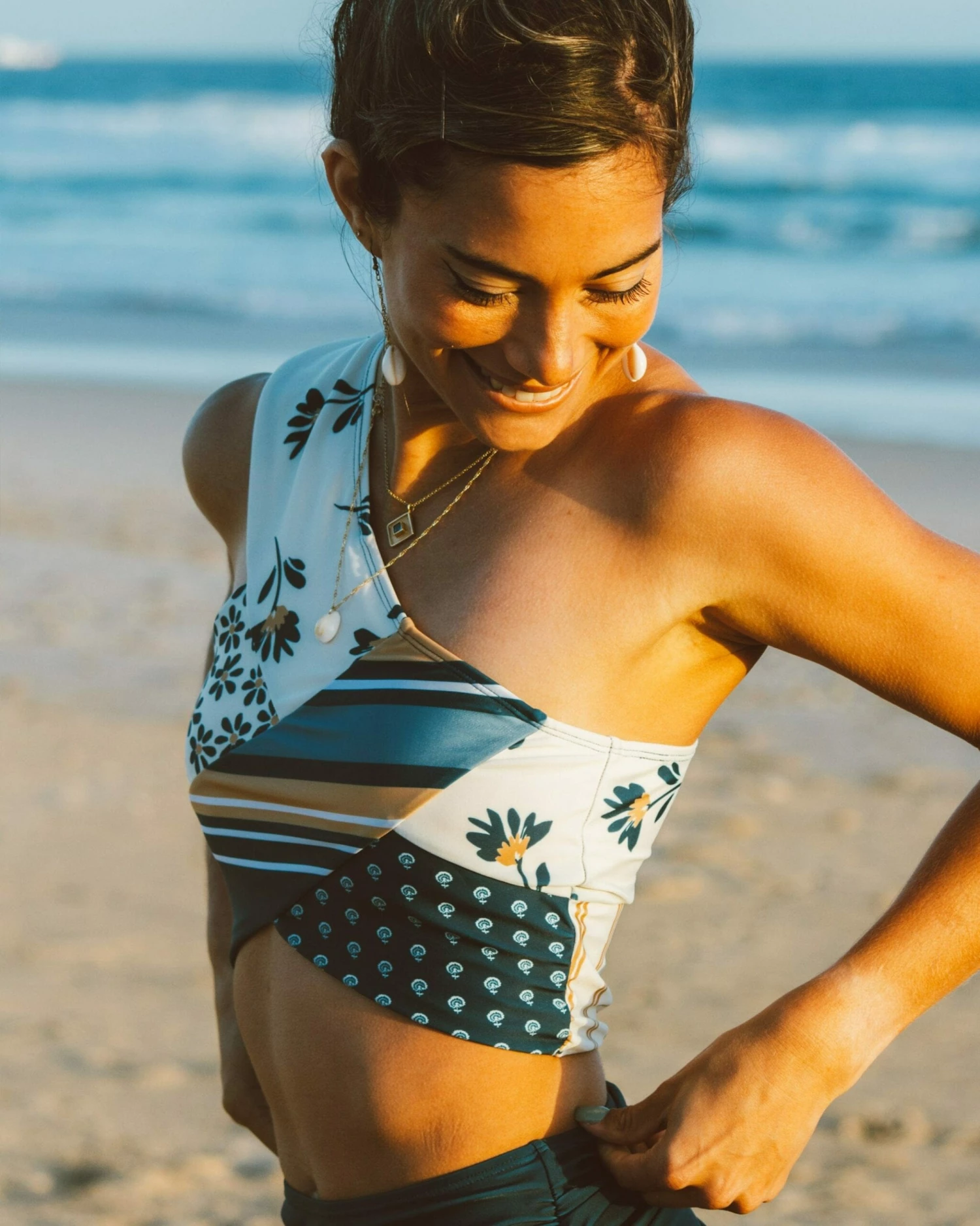 Looking for something NEW and DIFFERENT? This patchwork design is just what you have been waiting for! The one-shoulder, flattering fit keeps you covered and secure while showing off your style as you confidently dive into all your outdoor activities.